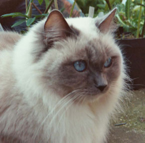 The points or extremities of the cat: face, ears, front legs and tail, have well defined colour. Mask can sometimes show a white blase. Chest, stomach, back legs, front feet and ruff are white. Body colour lighter than point colour.